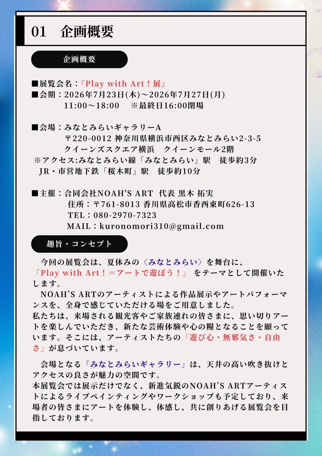 【Play with Art!展】 【会場】みなとみらいギャラリーA (〒220-0012 神奈川県横浜市西区みなとみらい2-3-5 クイーンズスクエア横浜 クイーンモール2階) ※アクセス:みなとみらい線「みなとみらい」駅 徒歩約3分、JR・市営地下鉄「桜木町」駅 徒歩約10分 【会期】2026.7.23〜7.27 【時間】11時00分〜18時(最終日は16時まで)
