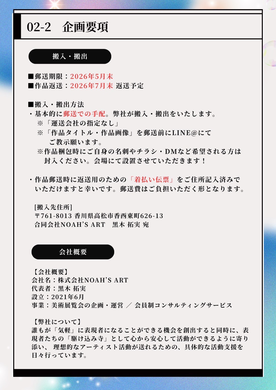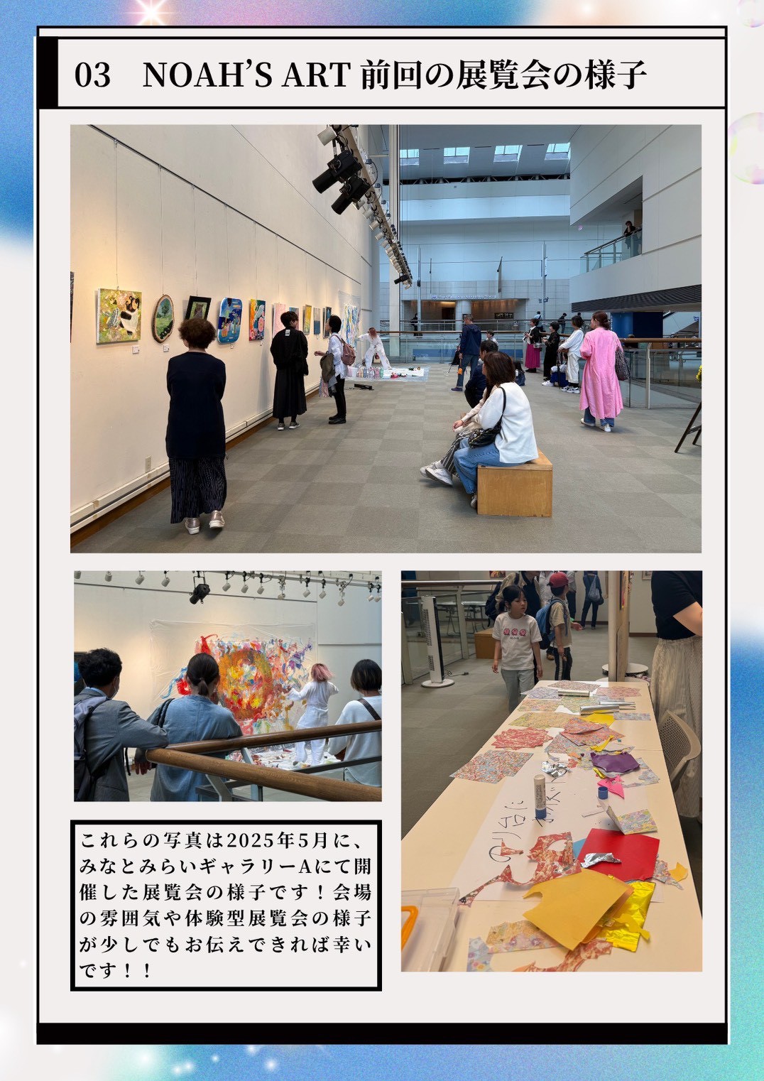 本展覧会では展示だけでなく、新進気鋭のNOAH’S ARTアーティストによるライブペインティングやワークショップも予定しており、来場者の皆さまにアートを体験し、体感し、共に創りあげる展覧会を目指しております。